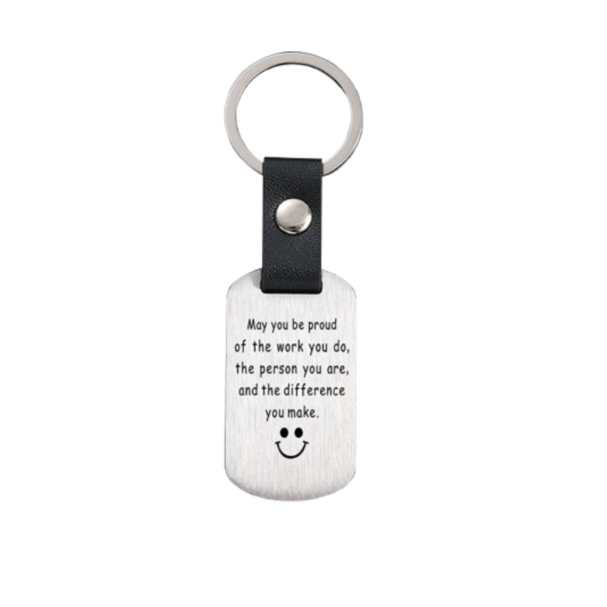 Durable metallic keyring featuring a laser-engraved "May You Be Proud Of The Work You Do, The Person You Are And The Difference You Make" logo. Lightweight and stylish, ideal for everyday use or gifting. Perfect addition for any retail outlet.